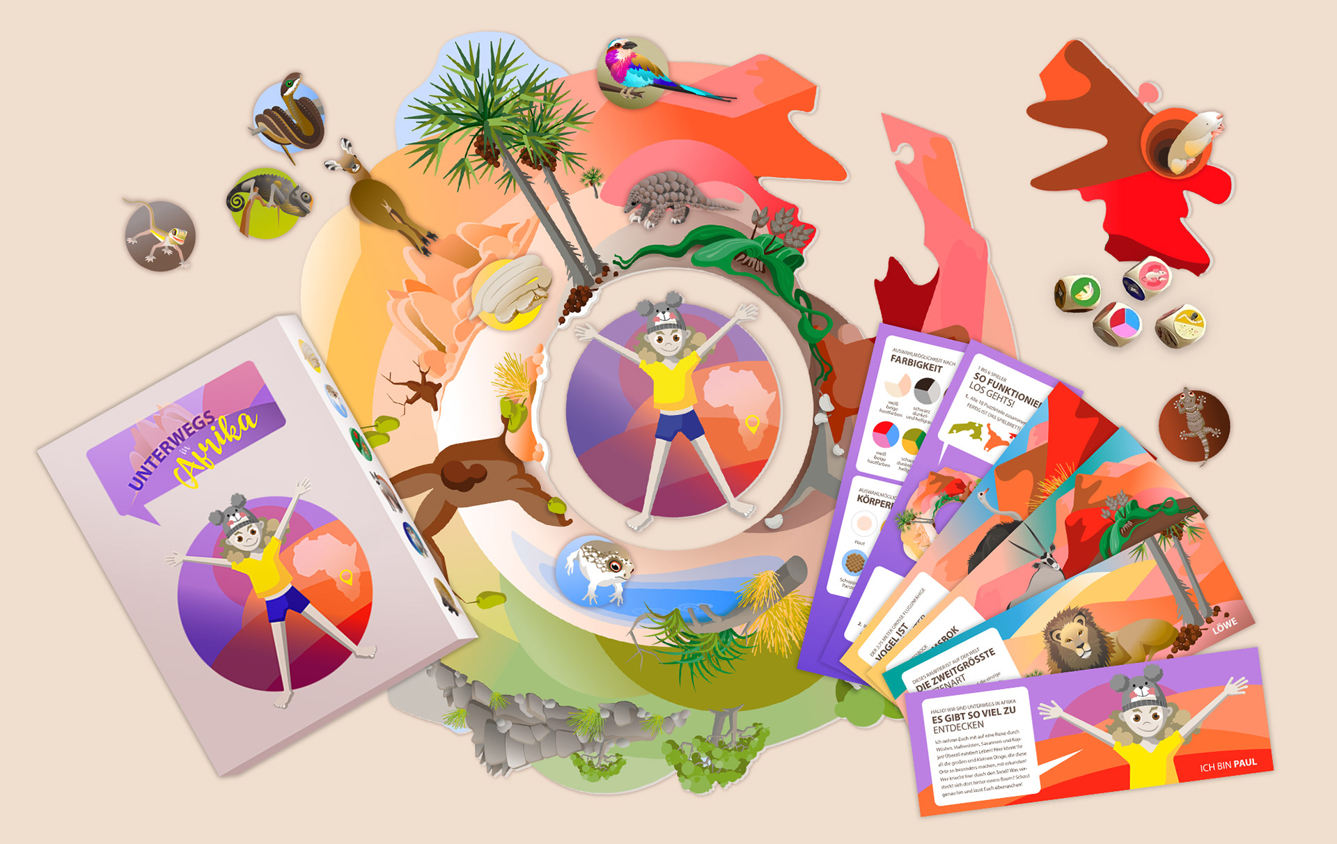 Wissenspiel für Kinder, mit vielen Hintergrundinformationen zum Thema: Südliches Afrika, der Tierwelt und den Lebensräumen. Zusammensetzbares Puzzle-Spielbrett. Altersstufe: Ab 3 Jahren.