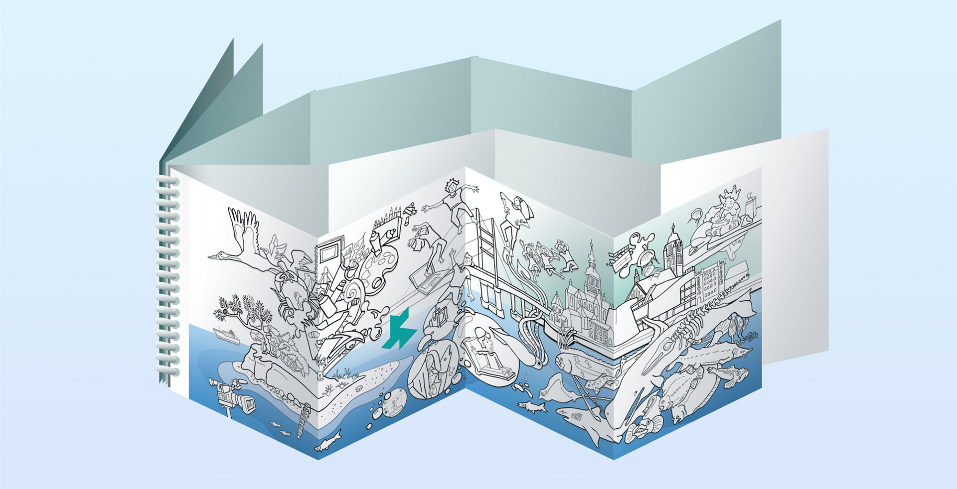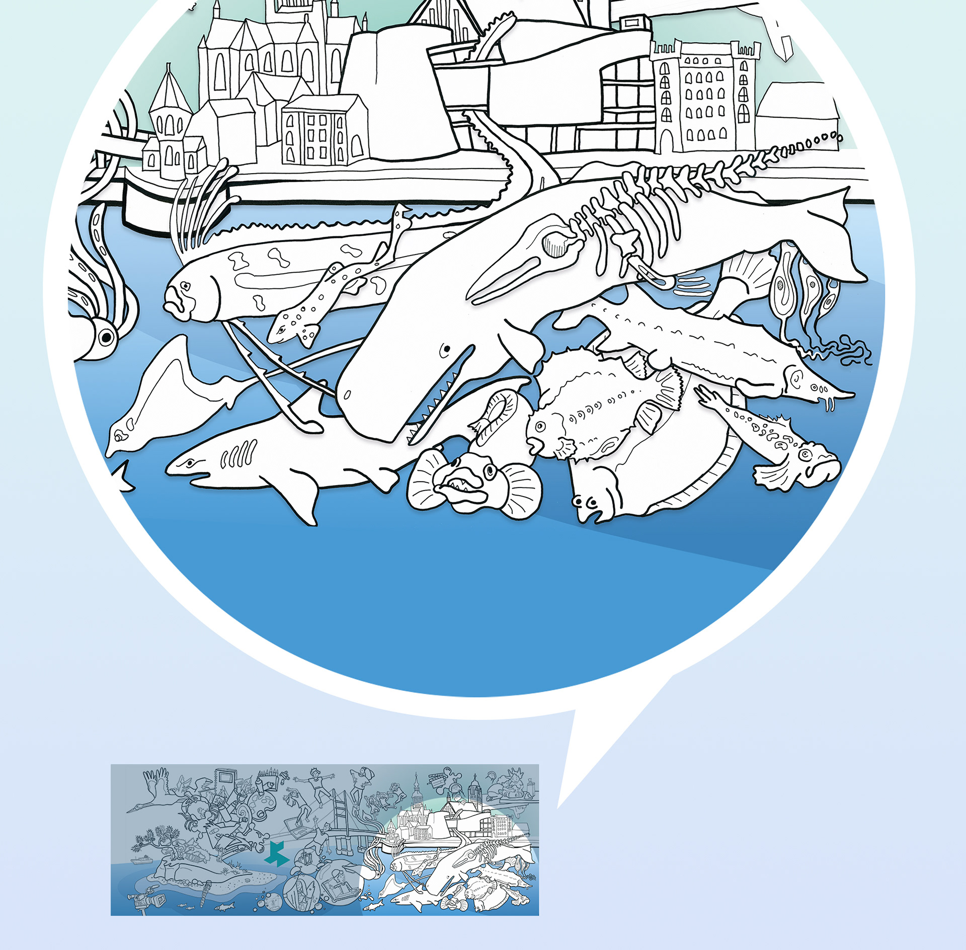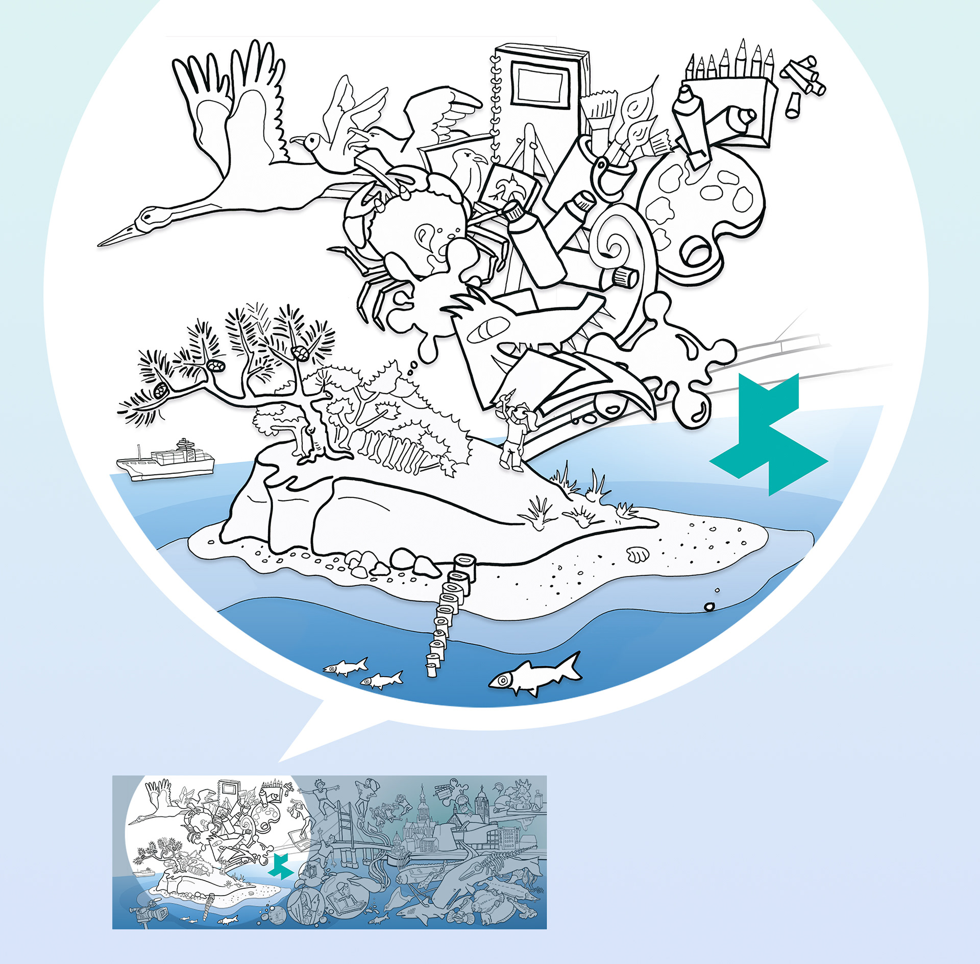 Illustration einer Inhaltsseite, von verschiedenen Künstlern, für ein Malbuch der Jugendkunstschule Vorpommern Rügen, mit dem Schwerpunkt Standort Stralsund